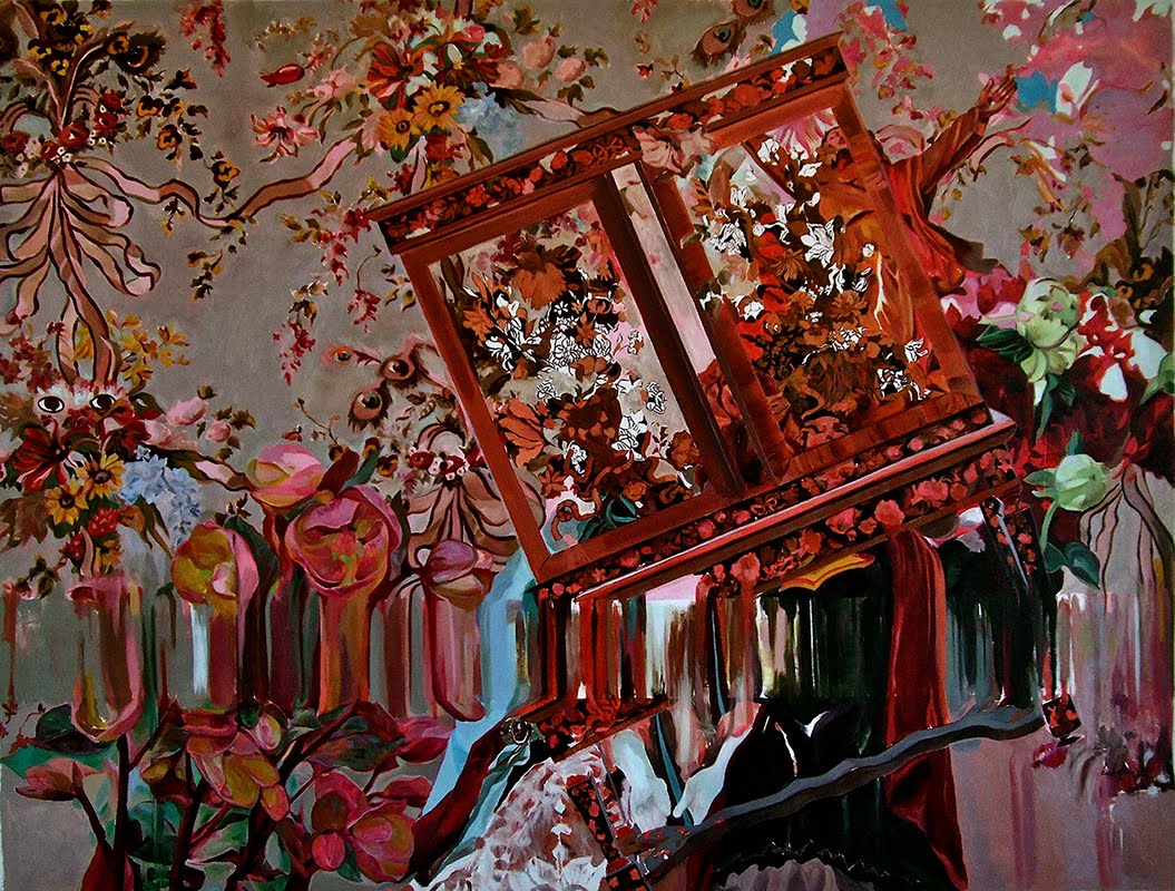 Her paintings underscore how both formal and symbolic beauty can be found in ornament. Aragon first utilised dot patterns and decorative cake icing motifs for her first shows during the early 2000s, later on exploring the potentials of floral patterns and motifs, set whimsically within interior spaces, by 2006. Playfully moving forth between gesture and colour, abstraction and figuration, her current works incorporate floral imagery with elements from both imagined scenarios and documented memories: producing vividly colored scenes with a heightened, keen sense of atmosphere and place.